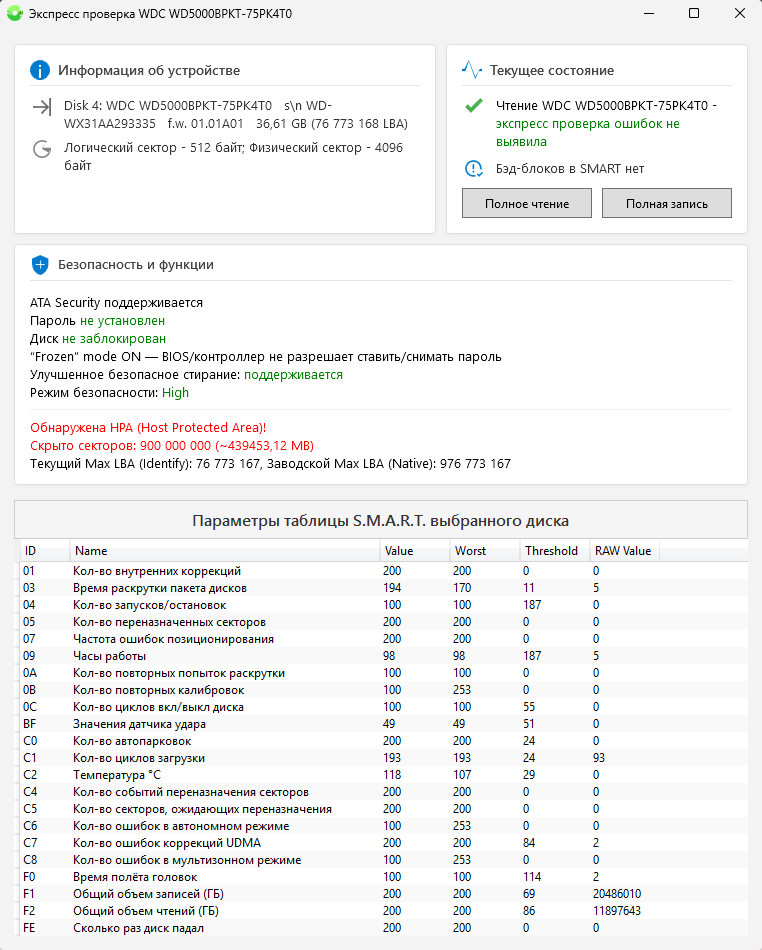 По желанию можно запустить полную проверку чтения всех секторов диска.