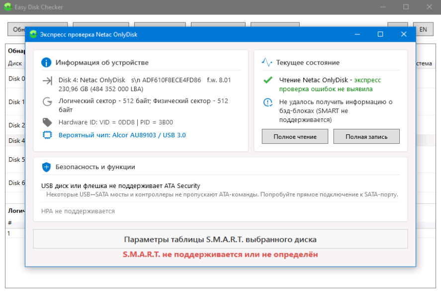 Если диск не читается, не смотря на корректный паспорт и объём, экспресс-проверка выдаст об этом сообщение.